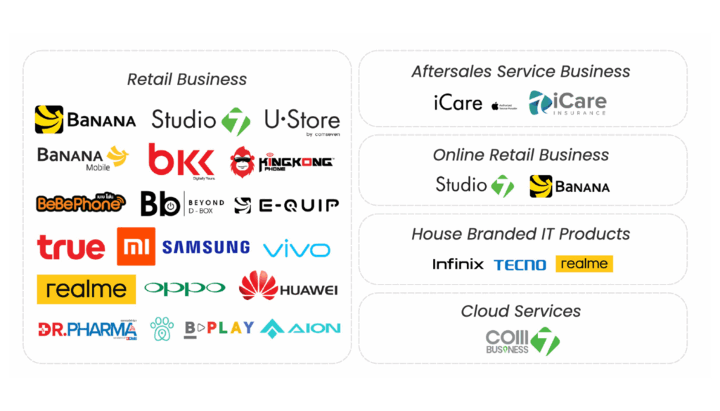บริษัท คอมเซเว่น จำกัด (มหาชน) ประกอบธุรกิจจำหน่ายสินค้าไอที ประเภทคอมพิวเตอร์แล็บท็อป คอมพิวเตอร์แบบตั้งโต๊ะ โทรศัพท์เคลื่อนที่ แท็บเล็ต สินค้า IT และอุปกรณ์เสริมต่างๆ ผ่านช่องทางการจำหน่ายหลัก รวมทั้งให้บริการศูนย์ซ่อมผลิตภัณฑ์ Apple